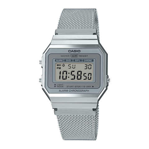 Orologio Digitale Casio A700WEM-7AEF collezione Vintage unisex. Orologio con cassa rettangolare in resina delle dimensioni di 37 x 34 mm e spessore di 6 mm. Quadrante digitale in colore argento. Orologio luminoso a...